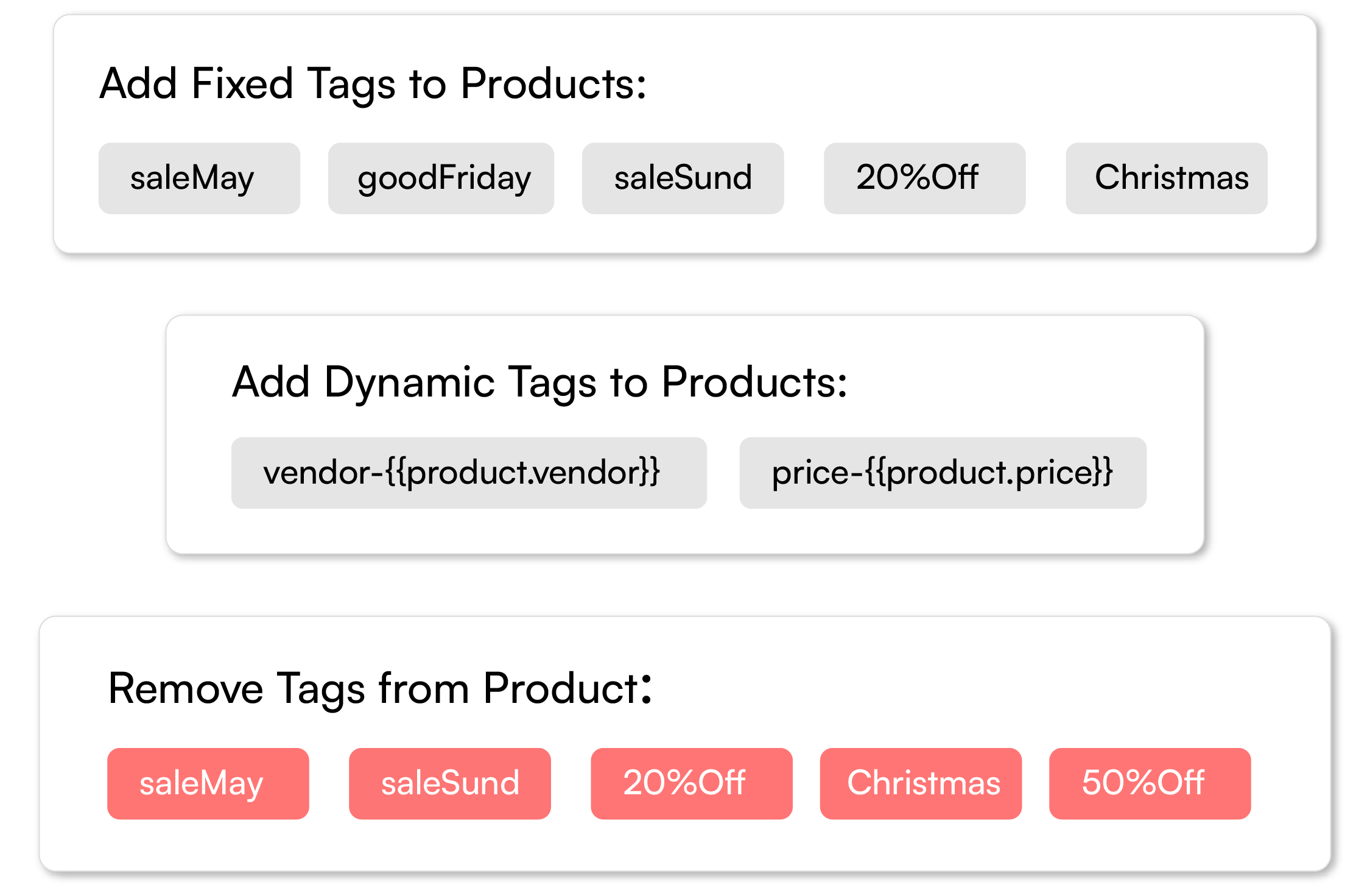 Tag products to enhance discovery e.g, you can tag products that are on sale, based on their variant options availability, or newly uploaded products in your store.